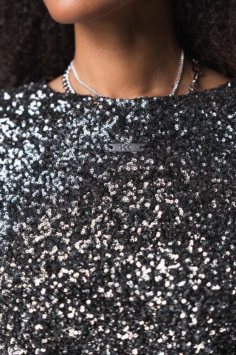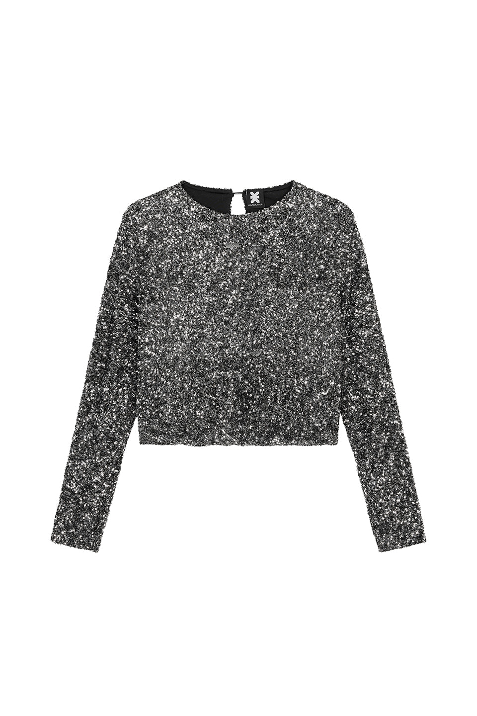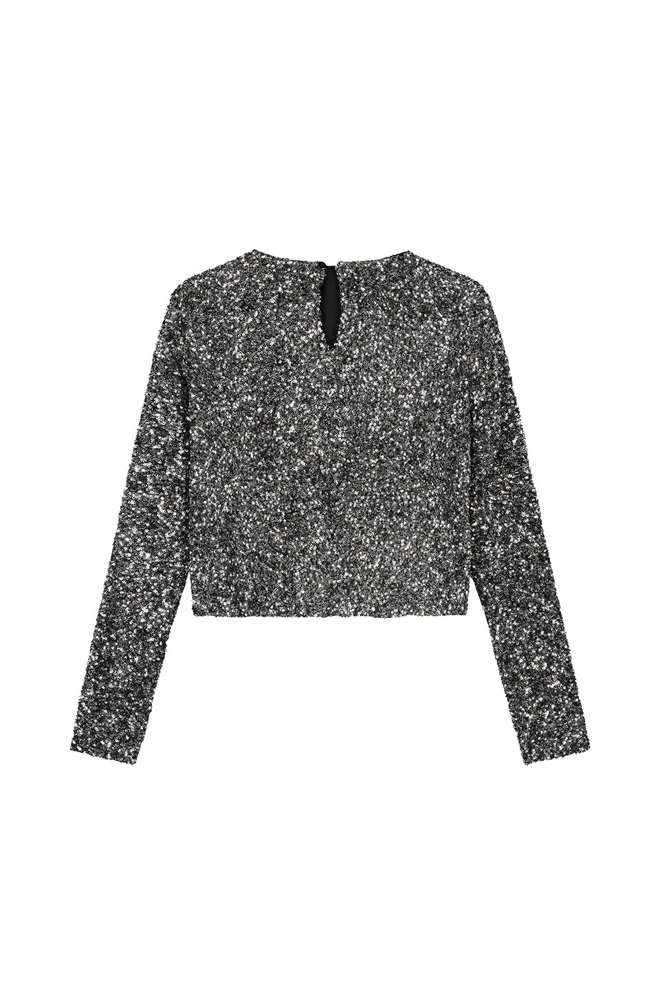 Ein glamouröses Longsleeve, das mit funkelnden Pailletten auf zartem Mesh alle Blicke auf sich zieht.