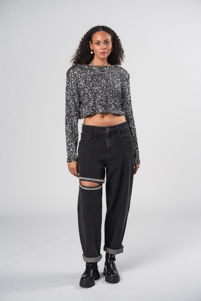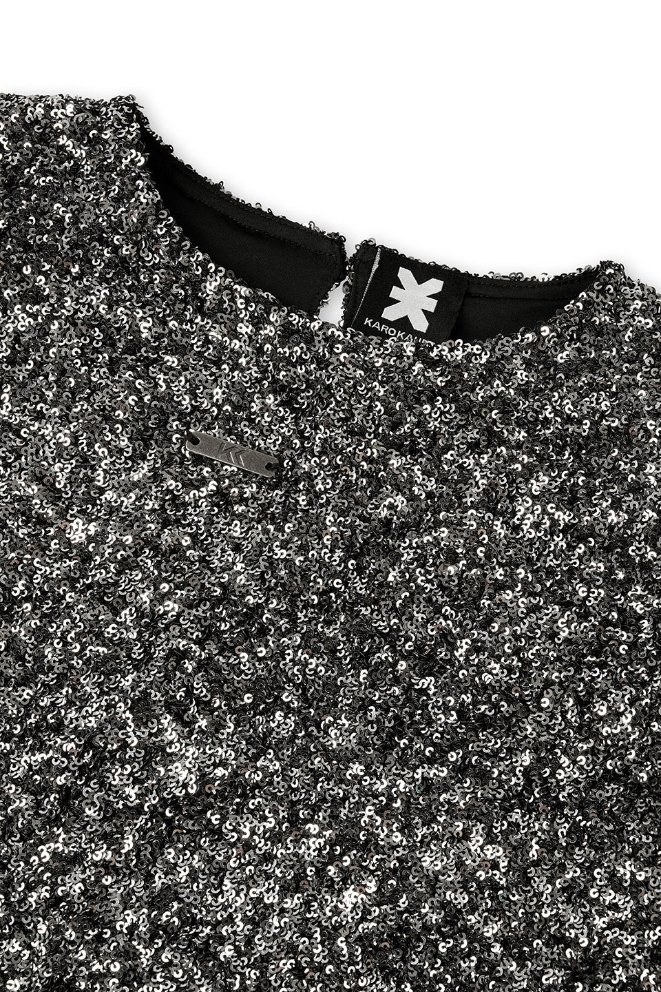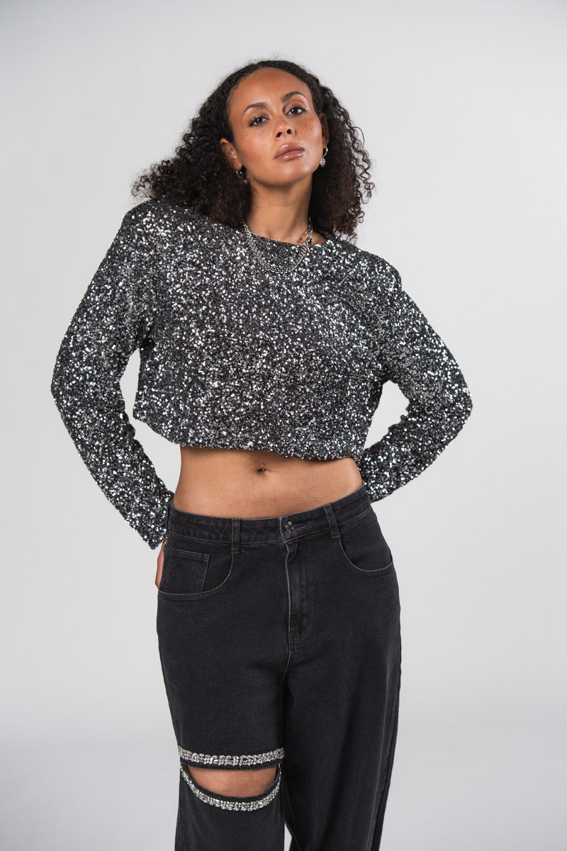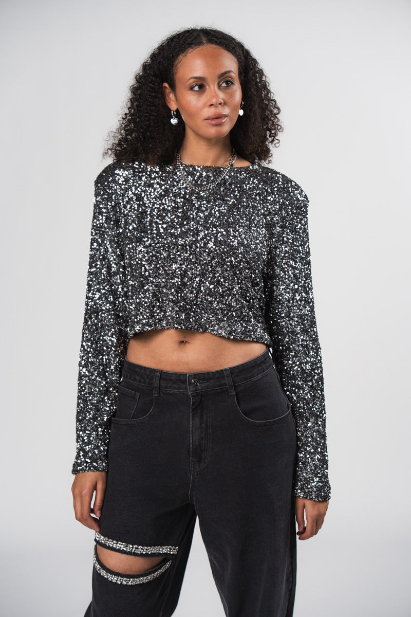 Ein glamouröses Longsleeve, das mit funkelnden Pailletten auf zartem Mesh alle Blicke auf sich zieht.