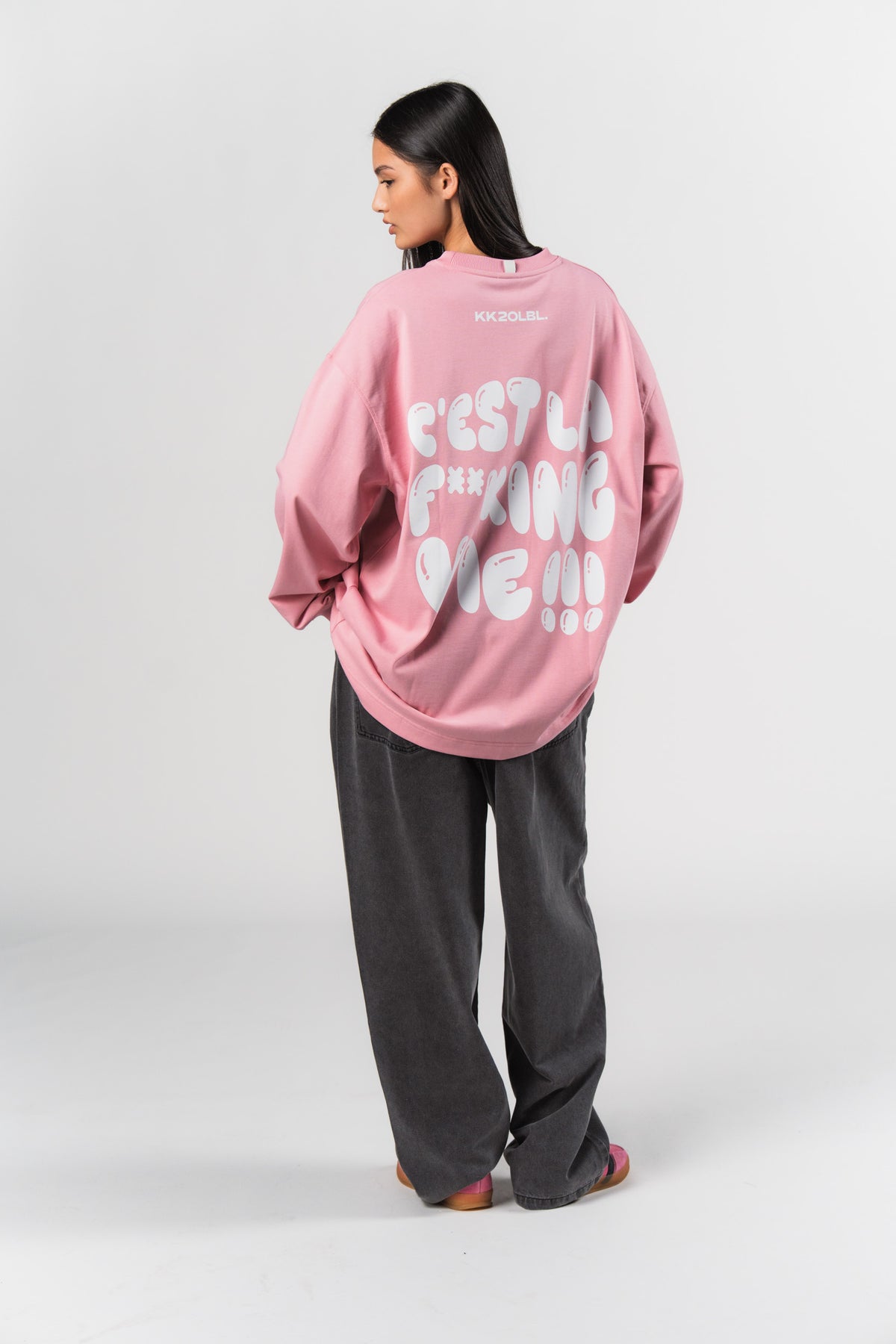 - markanter Schriftzug "C'est la f**king vie" auf dem Rücken