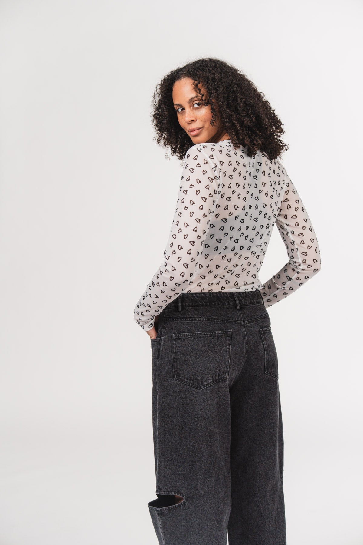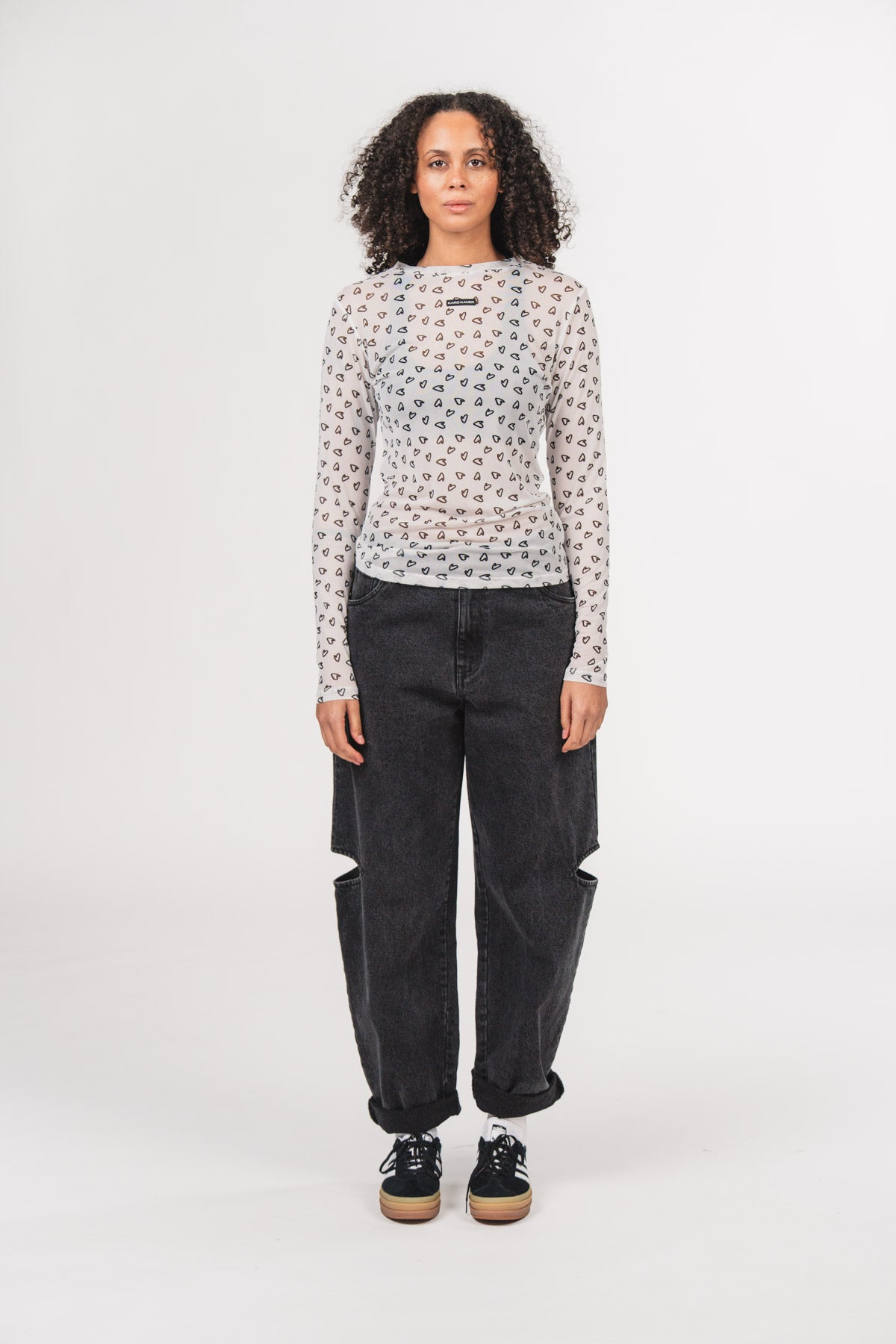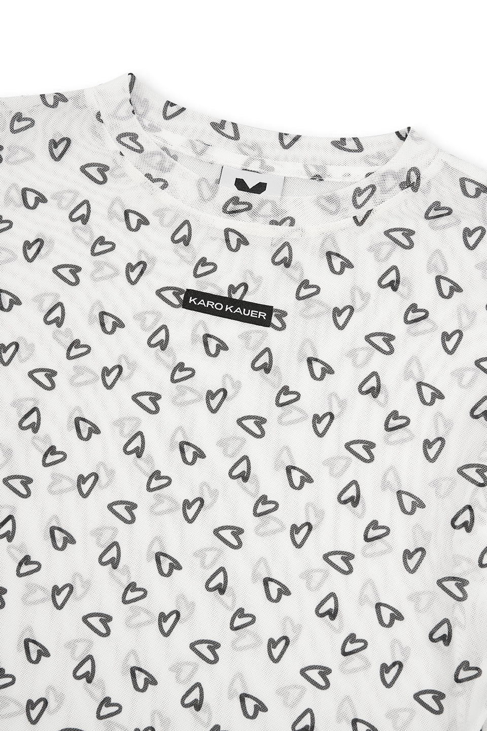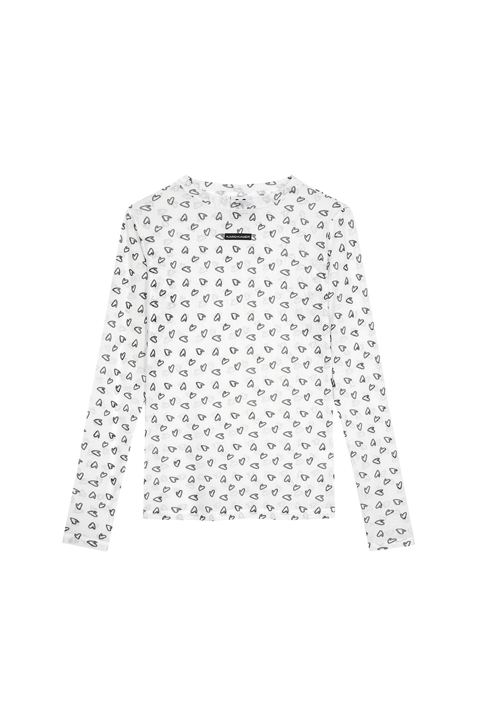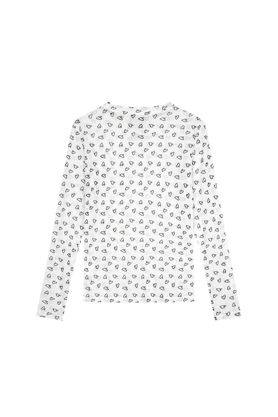 Ein figurbetontes Mesh-Longsleeve mit romantischem Allover-Herzprint – perfekt für Deinen individuellen Streetwear-Look.