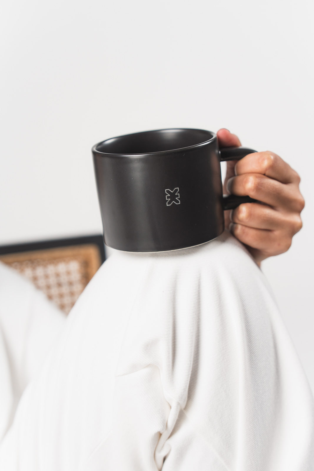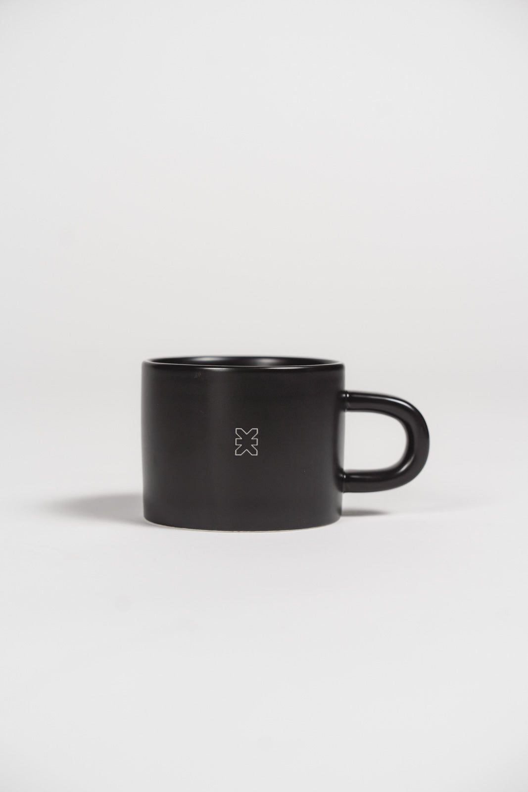Minimalistische Keramiktasse in mattem Schwarz mit exklusiven Logodetails.