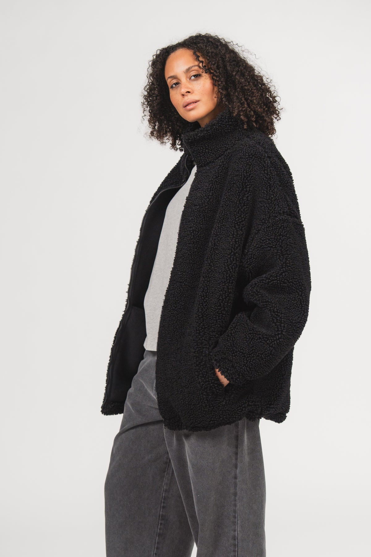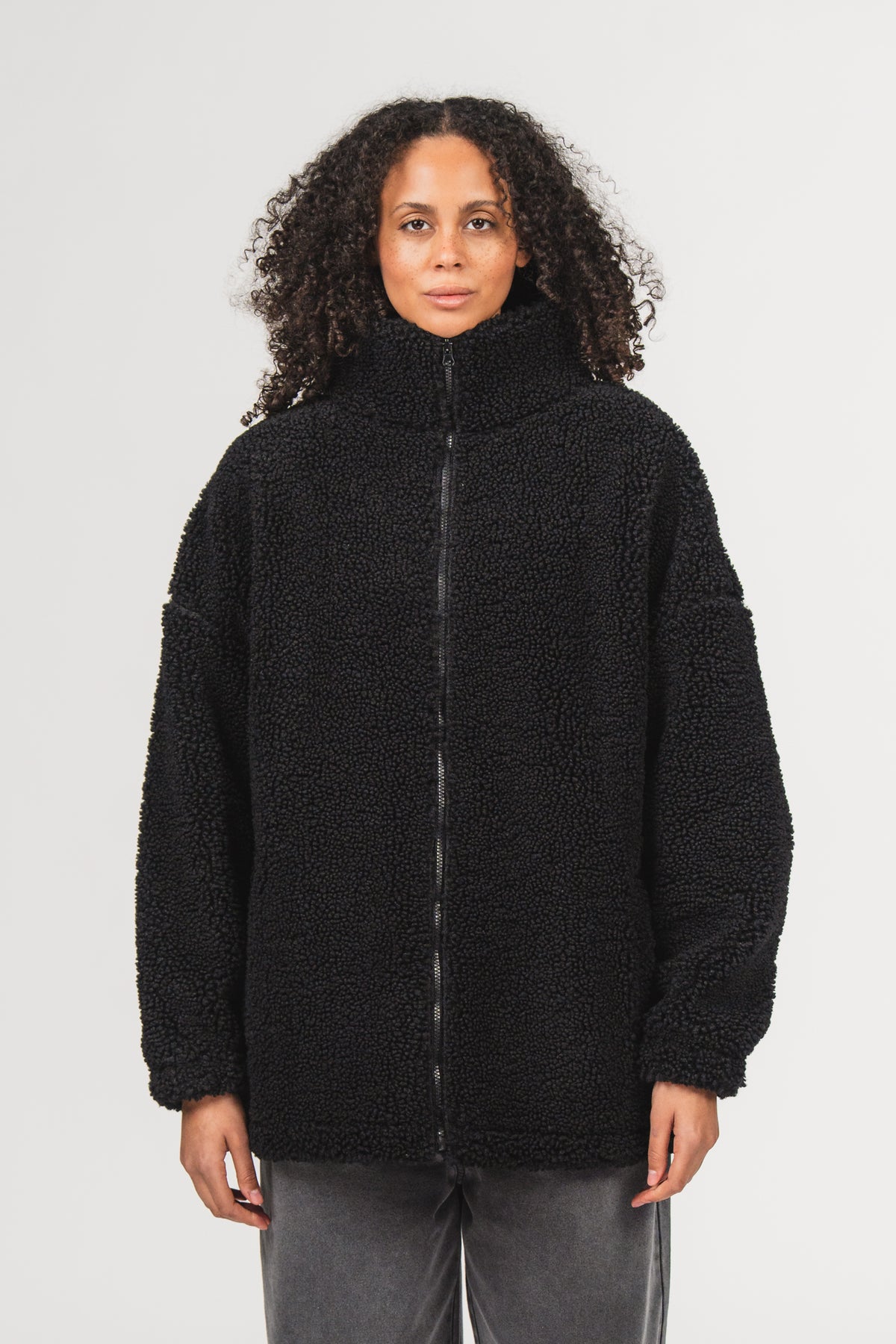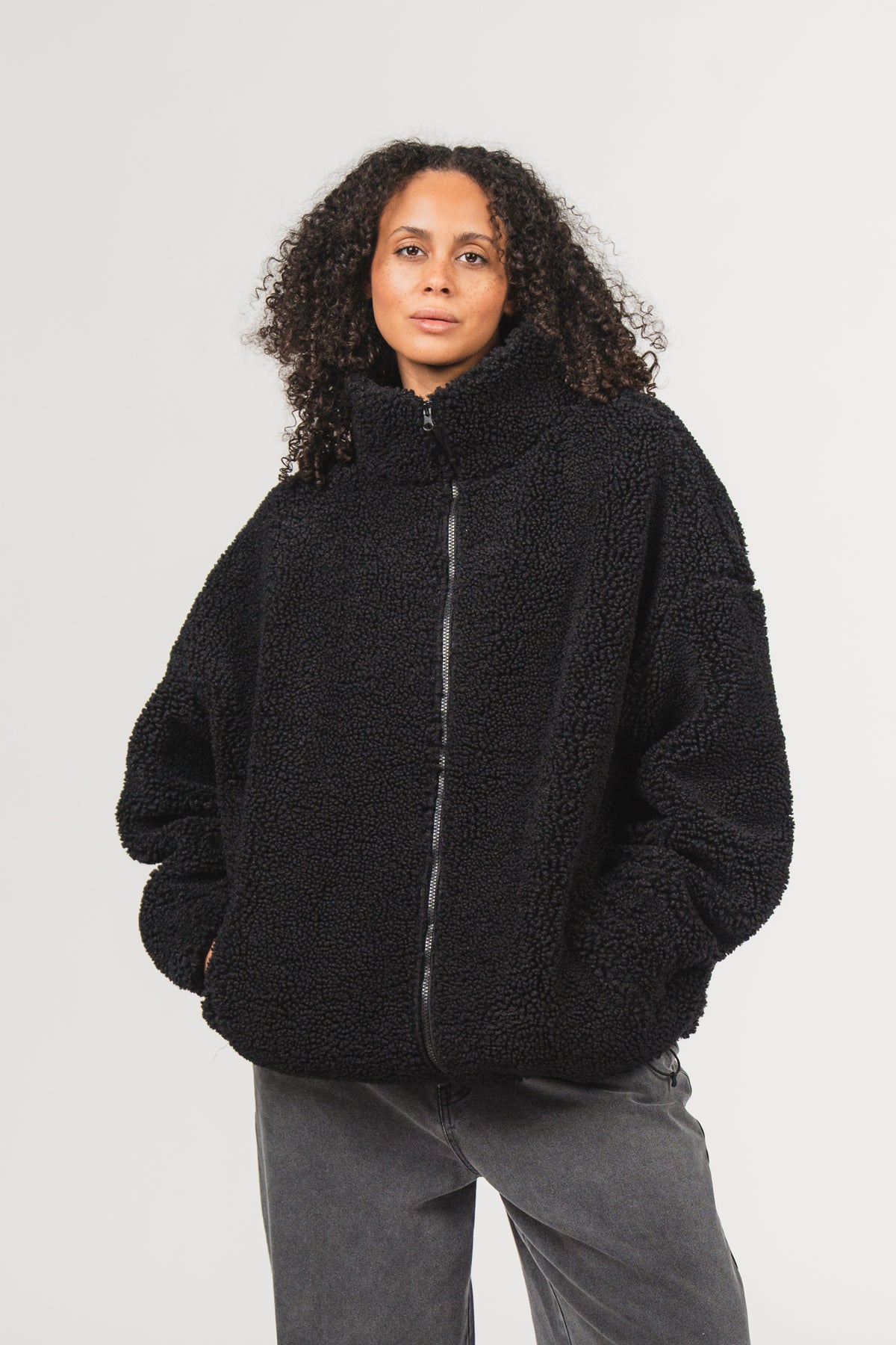 Eine kuschelige Teddy-Jacke in klassischem Schwarz – der perfekte Begleiter für kalte Tage.